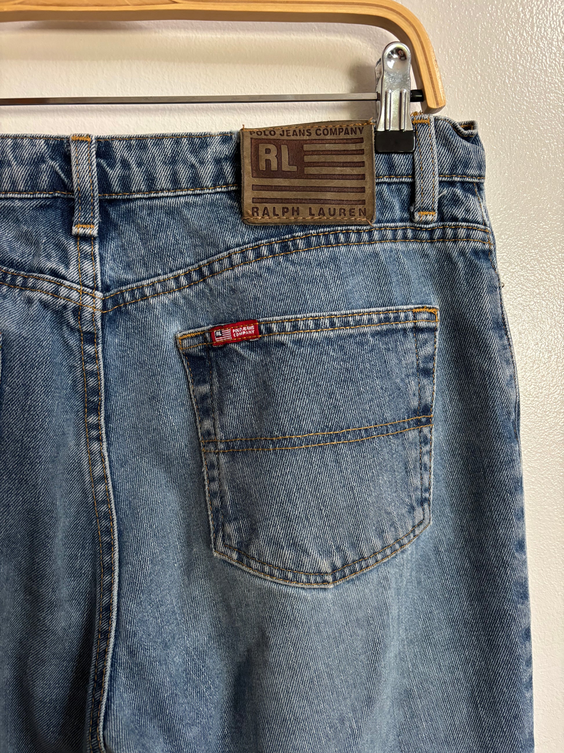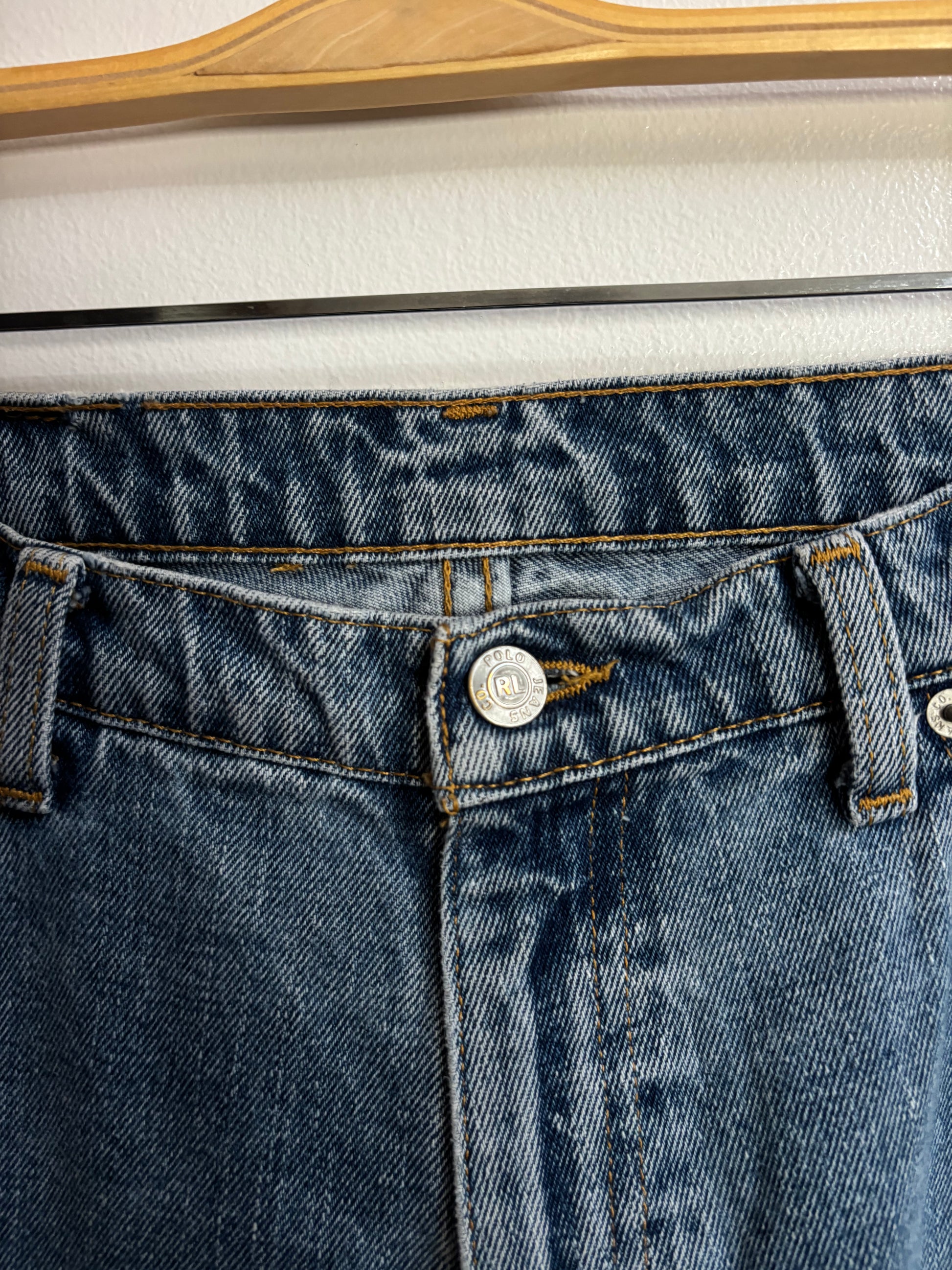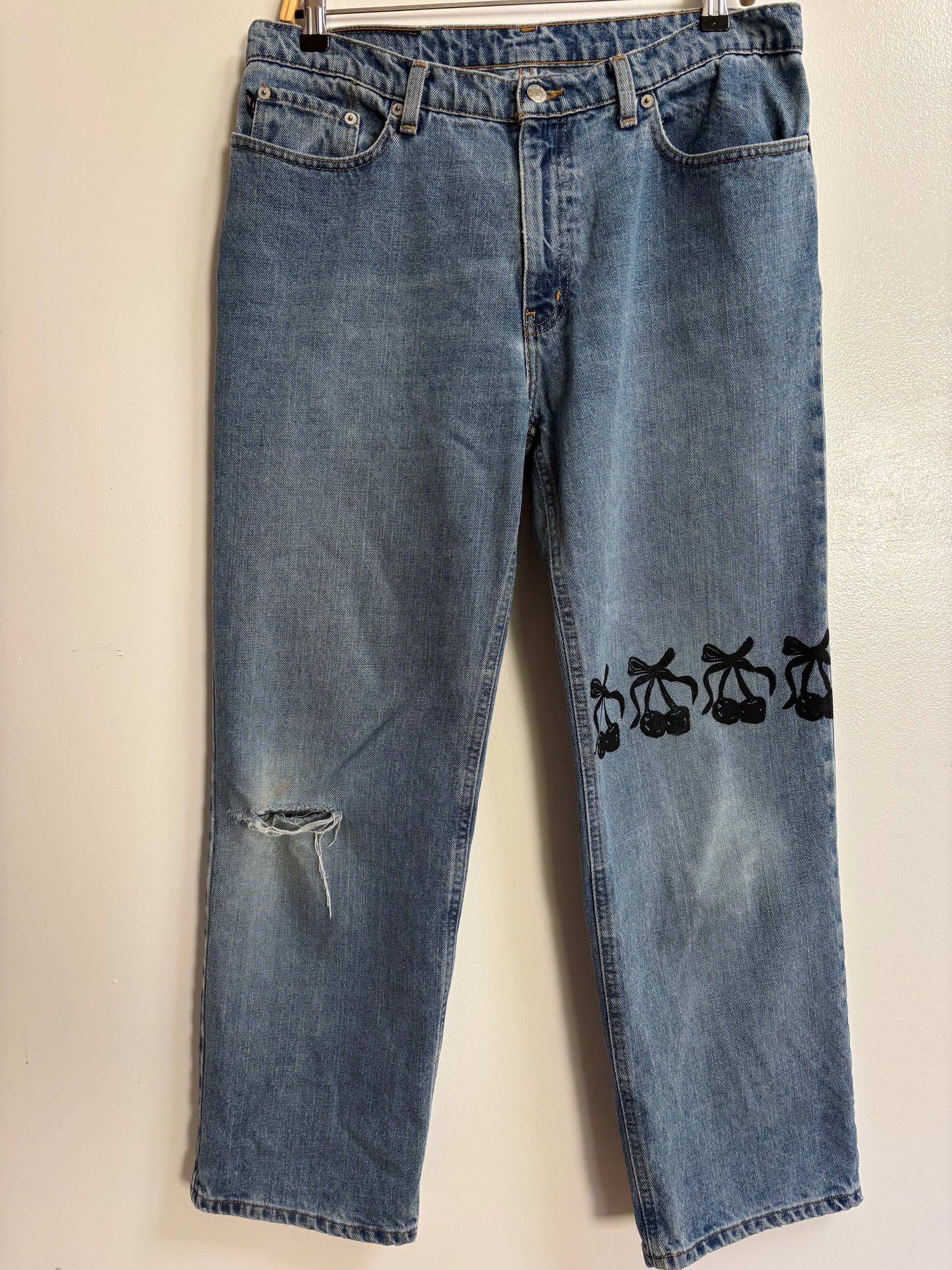 Cherry bow print above the knee, baggy 100% cotton, vintage jeans.