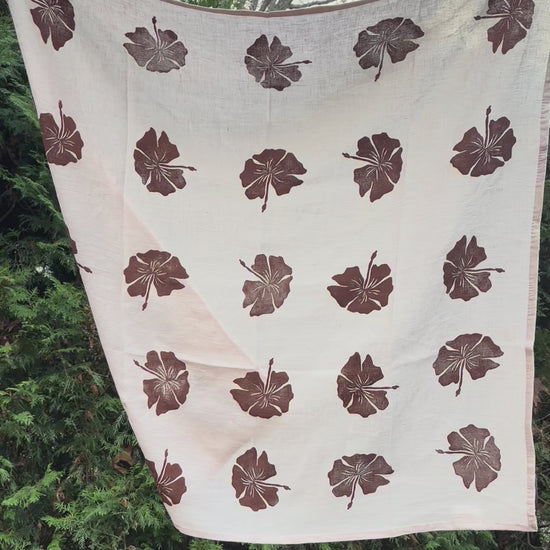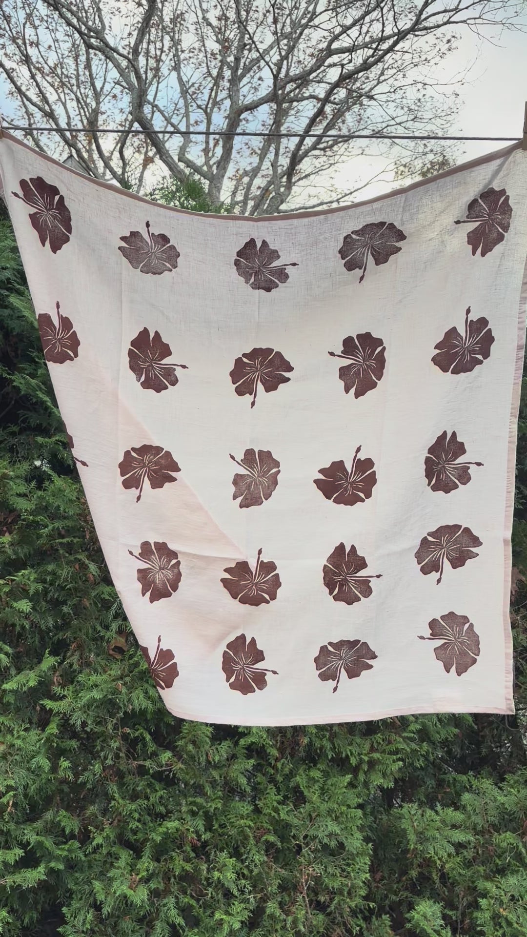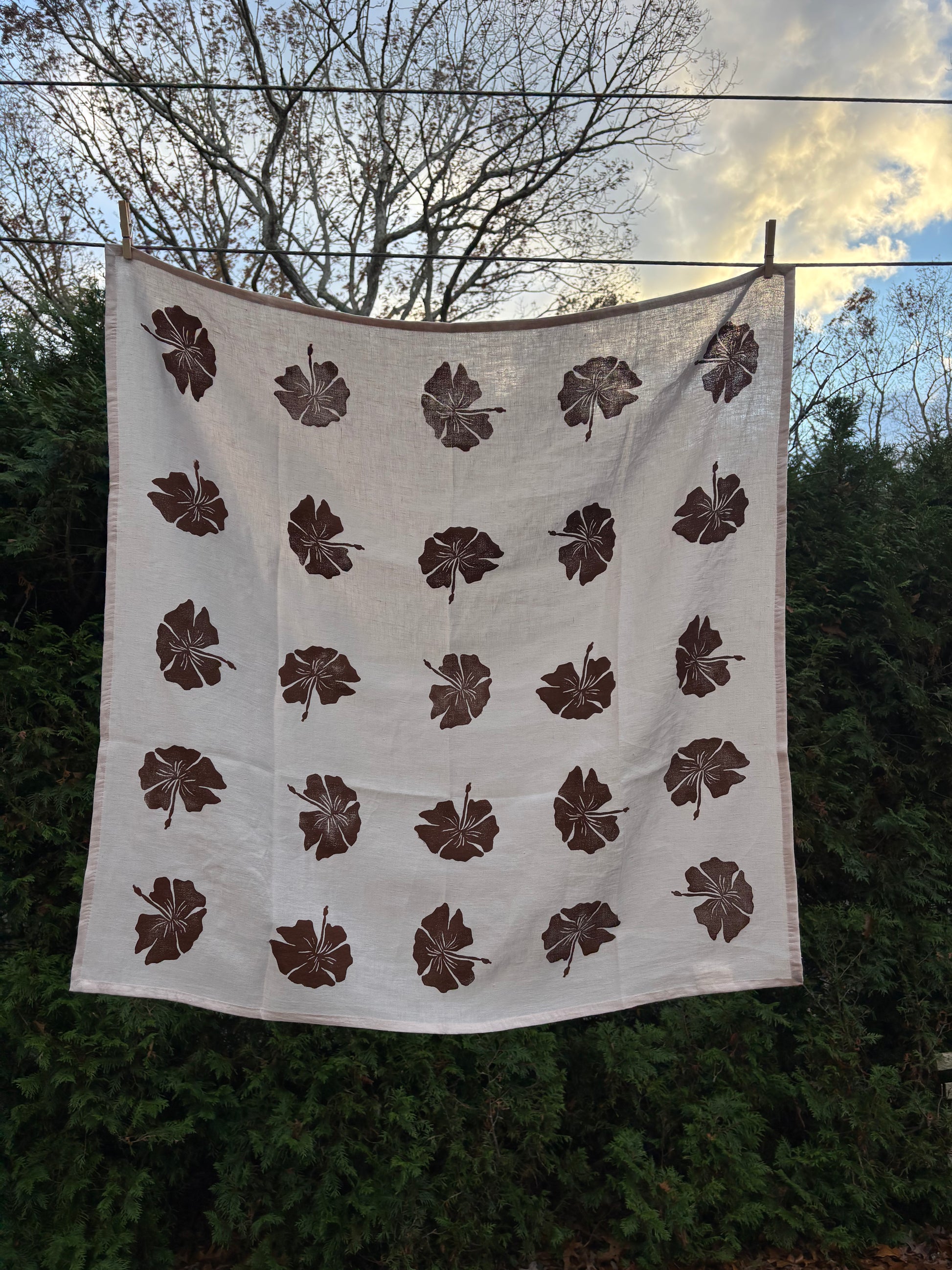 Ivory Bloom 39"x39" square, 100% linen new tablecloth, handprinted with brown hibiscus.